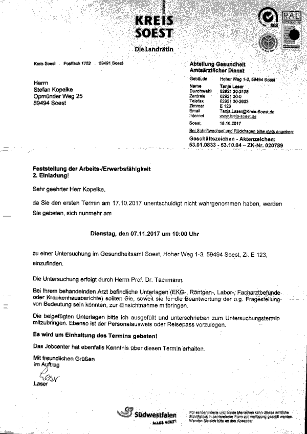 Hier ist die Ladung zur psychiatrischen Begutachtung, Auftraggeber Jobcenter. Ohne Einwilligung. Ich widersprach der medizinischen Begutachtung durch den Psychiater Tackmann wegen seines unverschämten Beratungs/Untersuchungs-Angebots ohne Nennung von Gründen vorher.